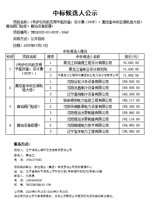 辽宁调兵山煤矸石发电有限责任公司2号炉引风机变频节能改造:设计费;集控室中央空调机组大修;首站阀门检修;首站设备修理中标候选人公示