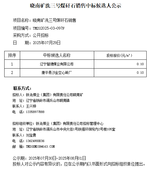 铁法煤业(集团)有限责任公司晓南矿洗三号煤矸石销售中标候选人公示