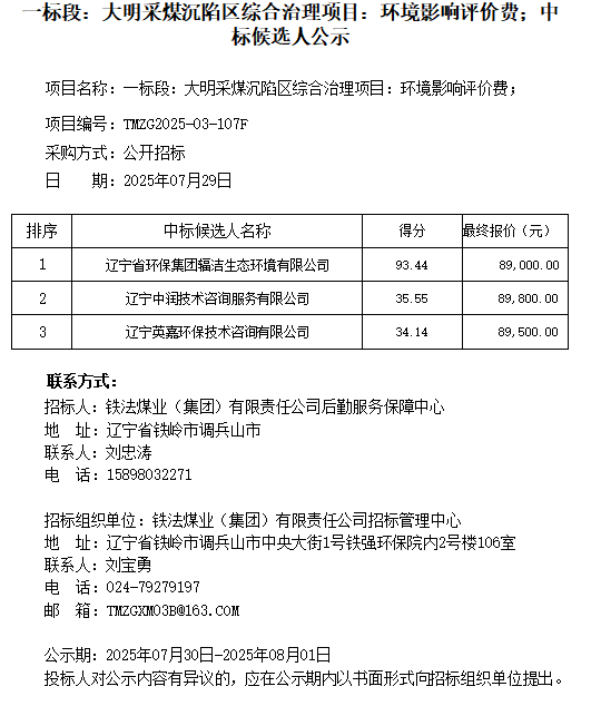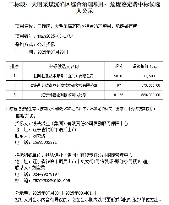 后勤服务保障中心大明采煤沉陷区综合治理项目:环境影响评价费;大明采煤沉陷区综合治理项目:危废鉴定费开标情况中标候选人公示及否决原因公示