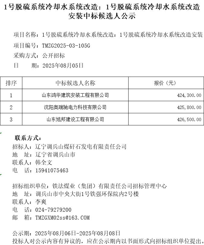 辽宁调兵山煤矸石发电有限责任公司1号脱硫系统冷却水系统改造安装招标中标候选人公示