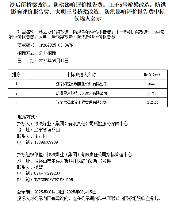 铁法煤业(集团)有限责任公司后勤服务保障中心桥梁改造防洪影响评价报告费中标候选人公示
