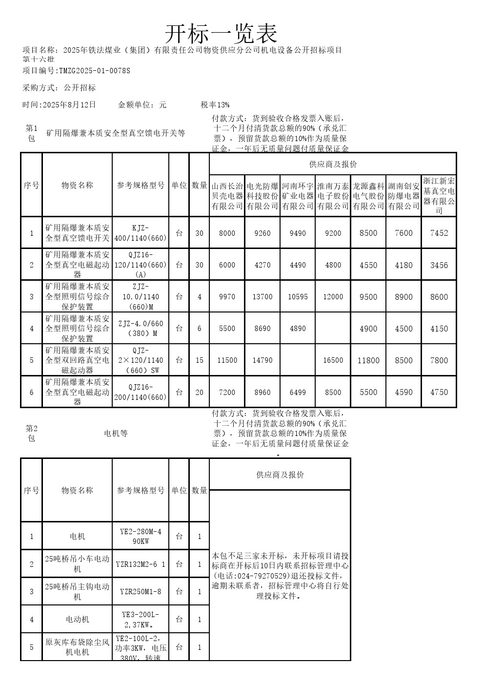 2025年8月12日设备公开招标报价一览表(0078S)