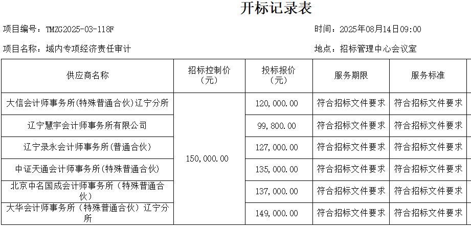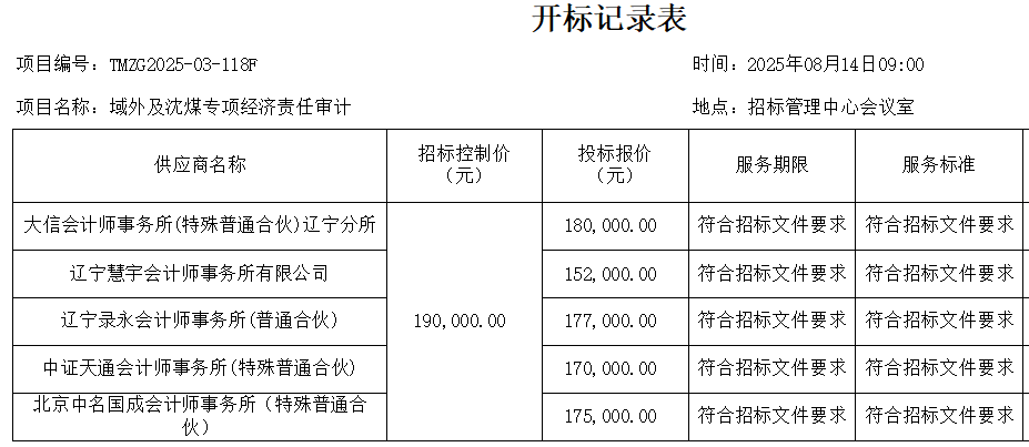 铁法煤业(集团)有限责任公司专项经济责任审计开标情况