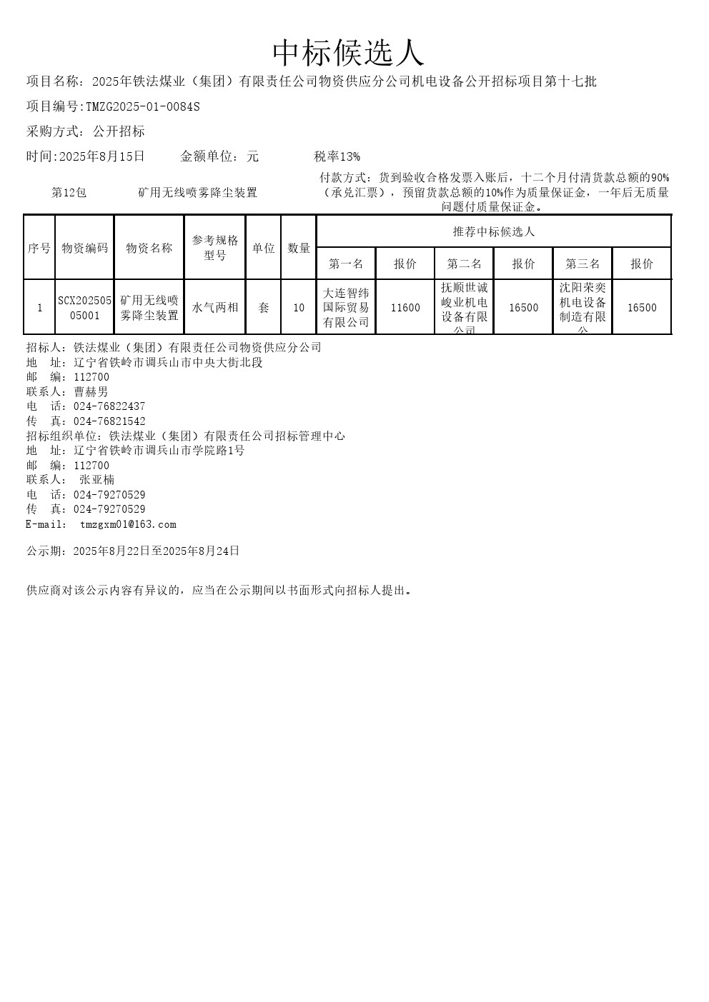 2025年8月15日机电设备第12包中标候选人更正(0084S)