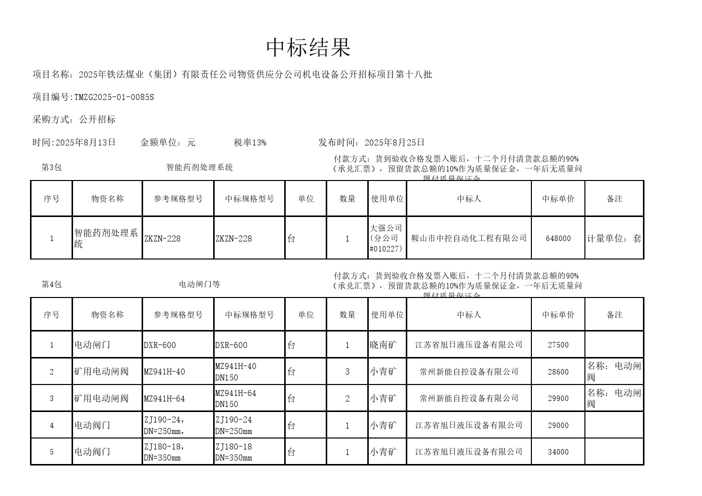 2025年8月13日设备公开招标中标结果公示(0085S)1