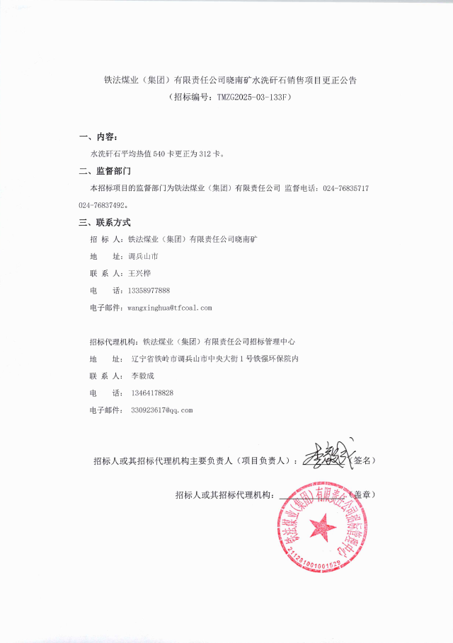 铁法煤业(集团)有限责任公司 晓南矿水洗矸石销售项目更正公告
