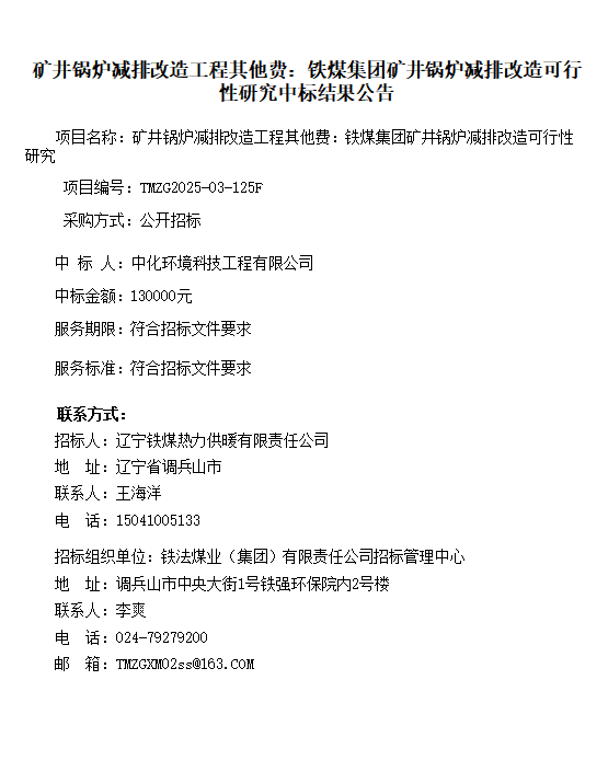 辽宁铁煤热力供暖有限责任公司矿井锅炉减排改造工程其他费:铁煤集团矿井锅炉减排改造可行性研究 中标结果公告