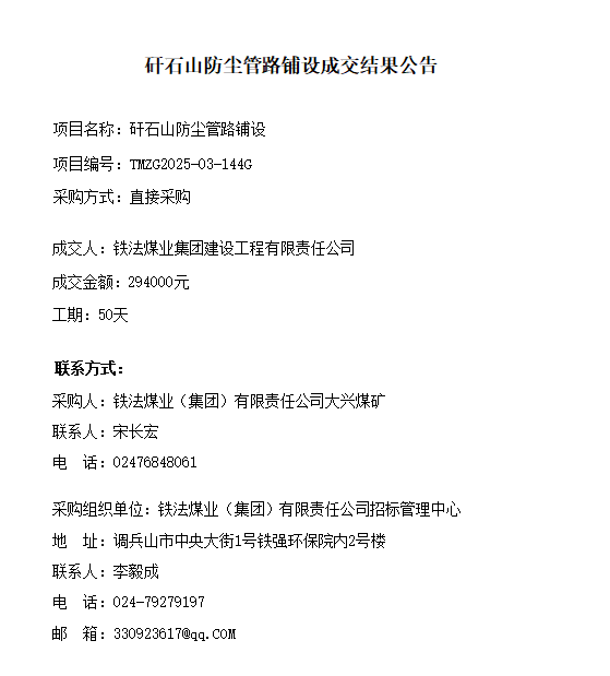 铁法煤业(集团)有限责任公司大兴煤矿 矸石山防尘管路铺设成交结果公告
