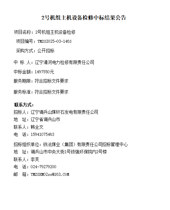 辽宁调兵山煤矸石发电有限责任公司2号机组主机设备检修中标结果公告
