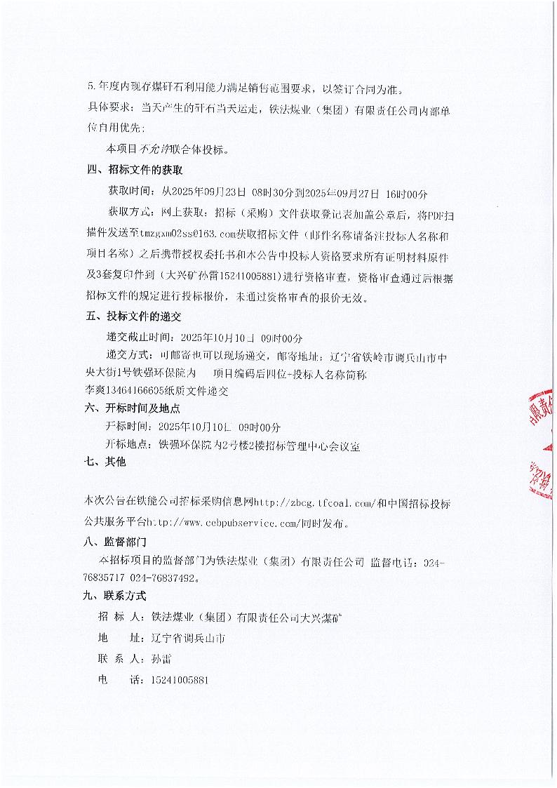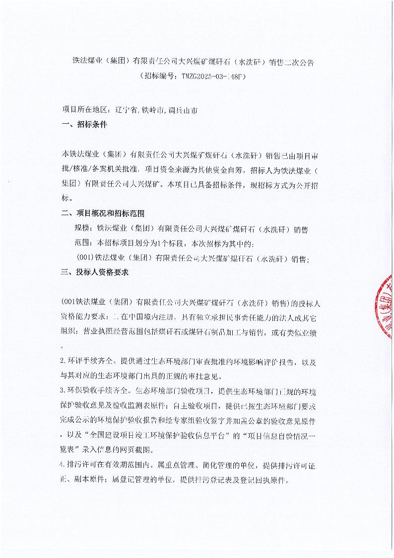 铁法煤业(集团)有限责任公司大兴煤矿煤矸石(水洗矸)销售招标公告(二次)