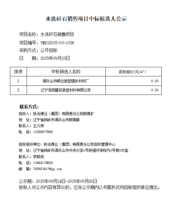 铁法煤业(集团)有限责任公司晓南矿水洗矸石销售项目候选人公示