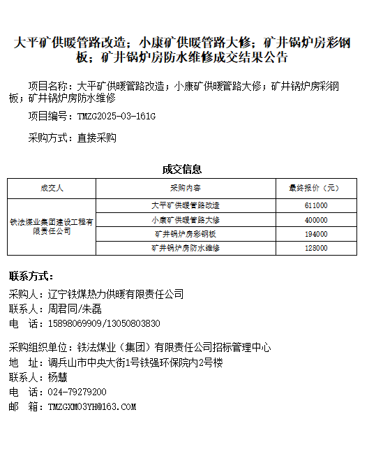 辽宁铁煤热力供暖有限责任公司大平矿供暖管路改造;小康矿供暖管路大修;矿井锅炉房彩钢板;矿井锅炉房防水维修成交结果公告