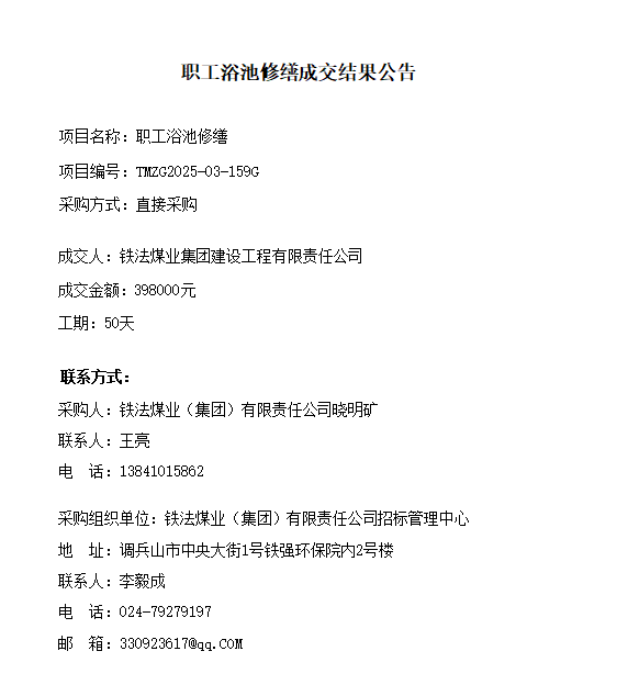 铁法煤业(集团)有限责任公司晓明矿职工浴池修缮成交结果公告