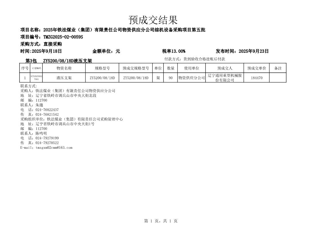 2025年9月18日综机设备预成交结果公告(0059S)