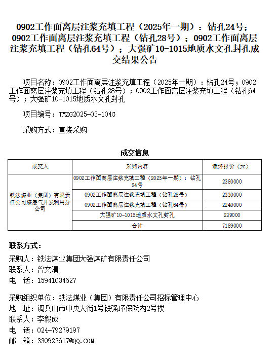0902工作面离层注浆充填工程(2025年一期):钻孔24号;0902工作面离层注浆充填工程(钻孔28号);0902工作面离层注浆充填工程(钻孔64号);大强矿10-1015地质水文孔封孔成交结果公告