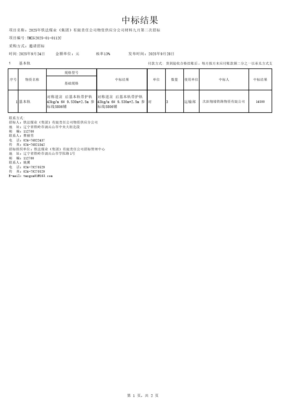 2025年9月24日材料邀请招标中标结果公告(0112C)