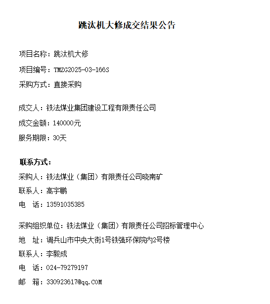 铁法煤业(集团)有限责任公司晓南矿跳汰机大修成交结果公告
