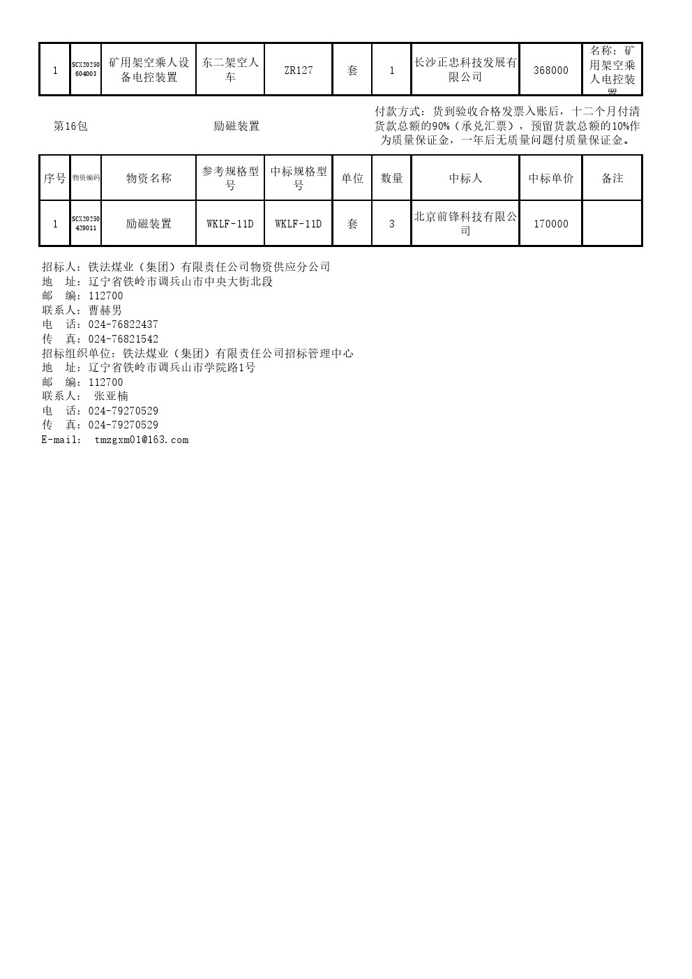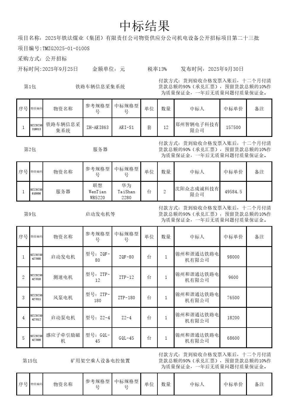 2025年9月25日机电设备公开招标中标结果公示(0100S)