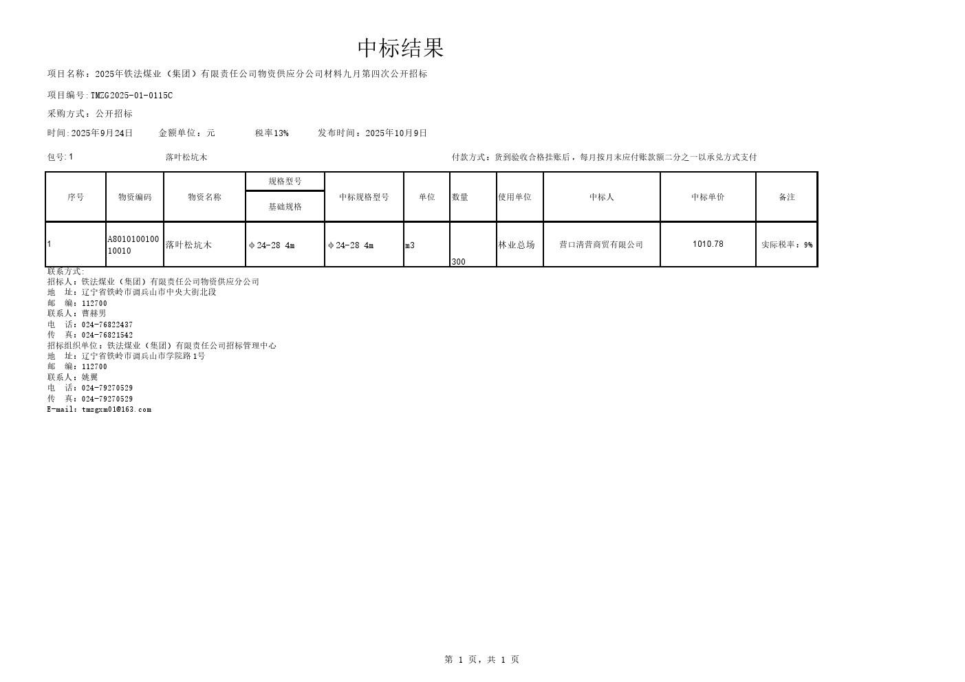 2025年9月24日材料公开招标中标结果公告(0115C)