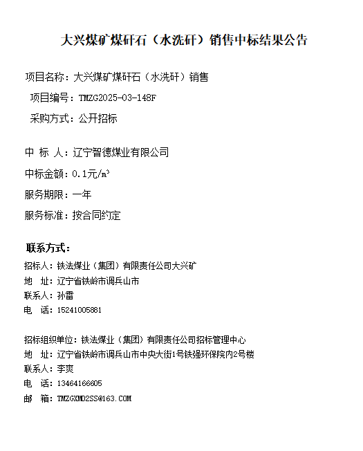 铁法煤业(集团)有限责任公司大兴煤矿煤矸石(水洗矸)销售中标结果公告