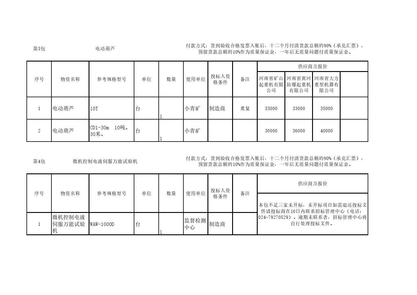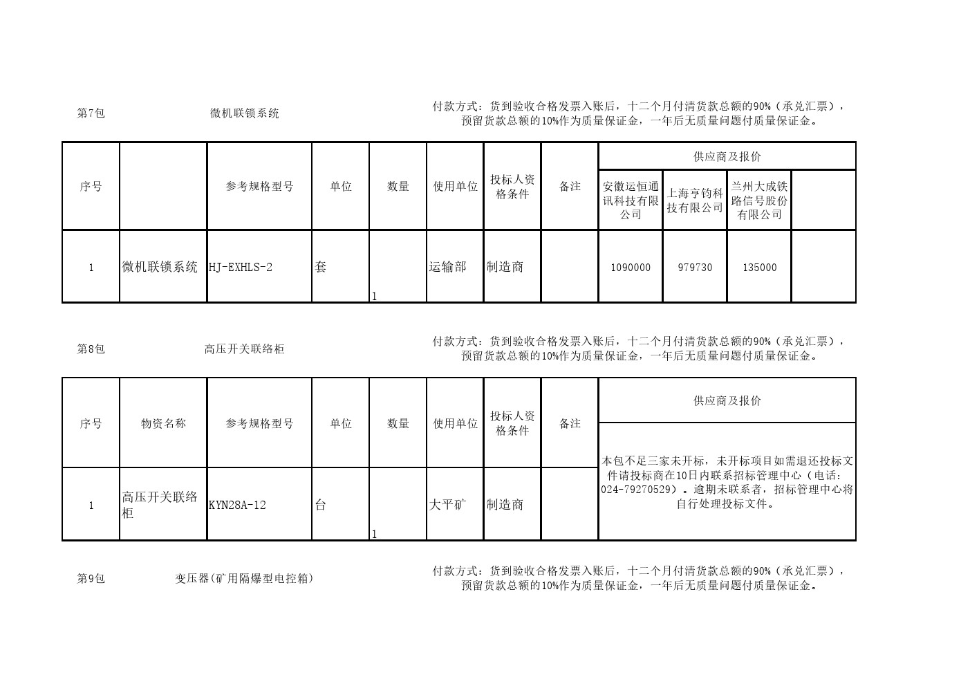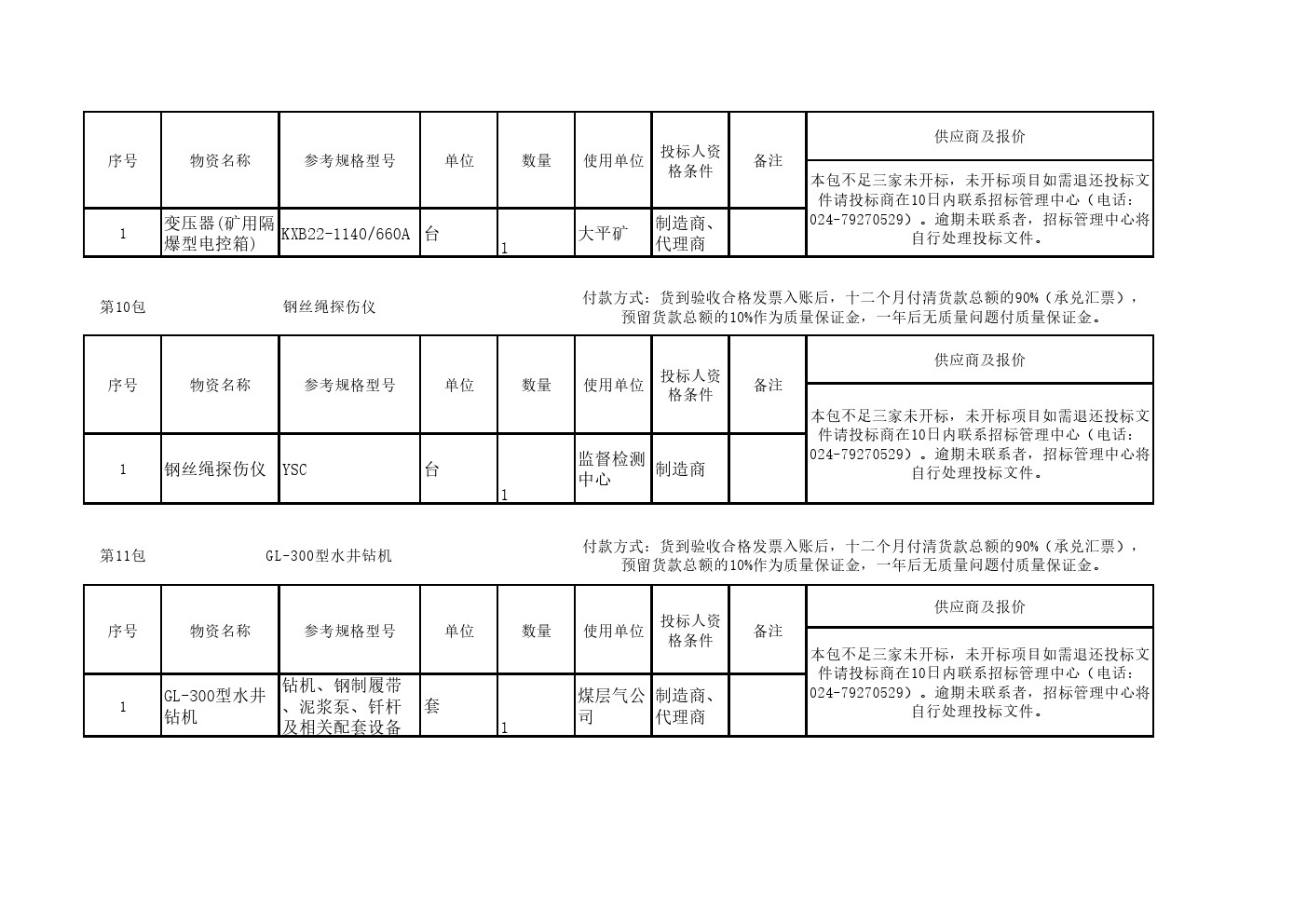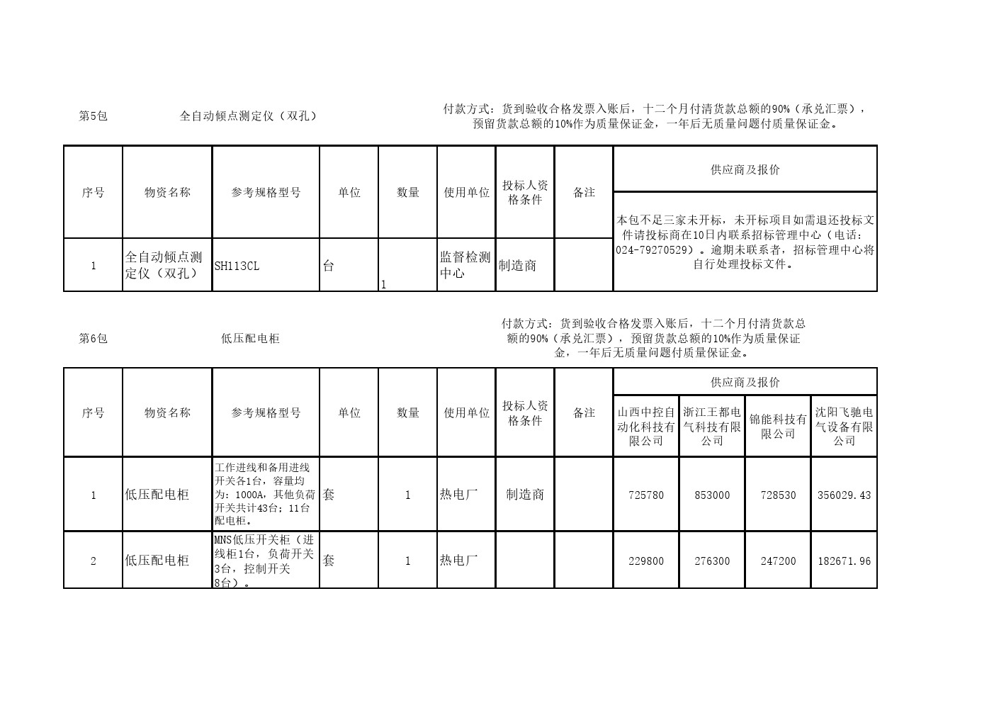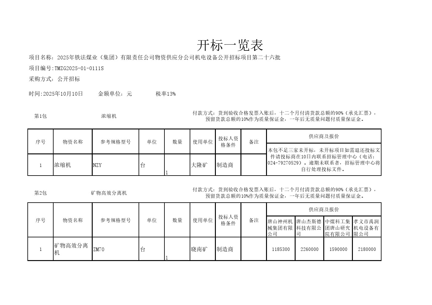 2025年10月10日设备第二十六批公开招标开标一览表(0111S)