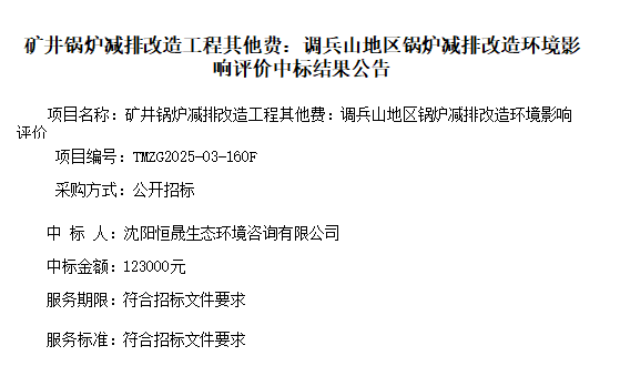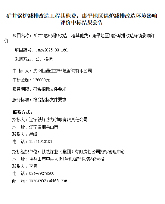 辽宁铁煤热力供暖有限责任公司矿井锅炉减排改造工程:锅炉减排改造环境影响评价中标结果公告