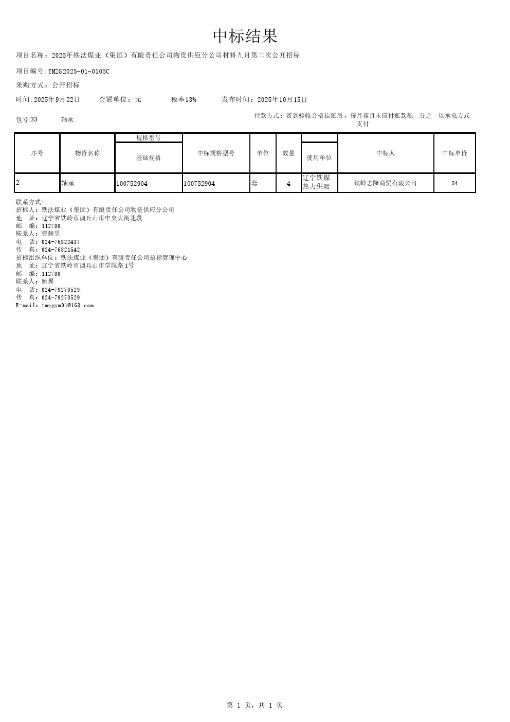 2025年9月22日材料公开招标第33包中标结果变更公告(0105C)