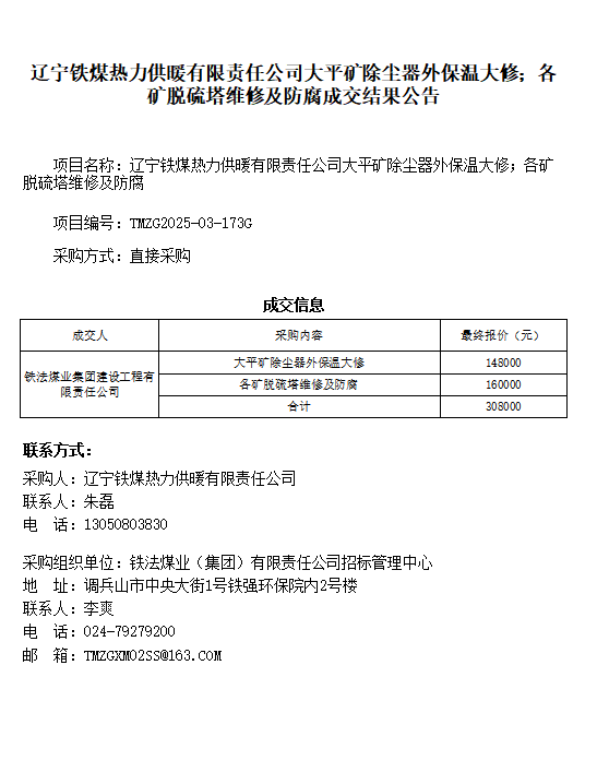 辽宁铁煤热力供暖有限责任公司大平矿除尘器外保温大修;各矿脱硫塔维修及防腐成交结果公告