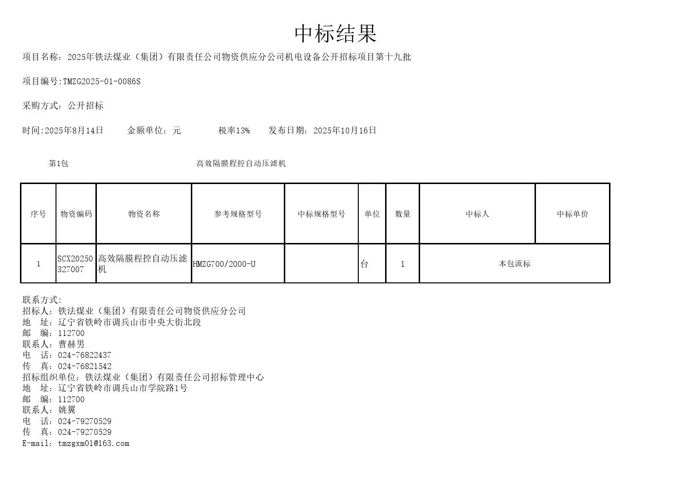 2025年8月14日设备公开招标中标结果公示(0086S)2