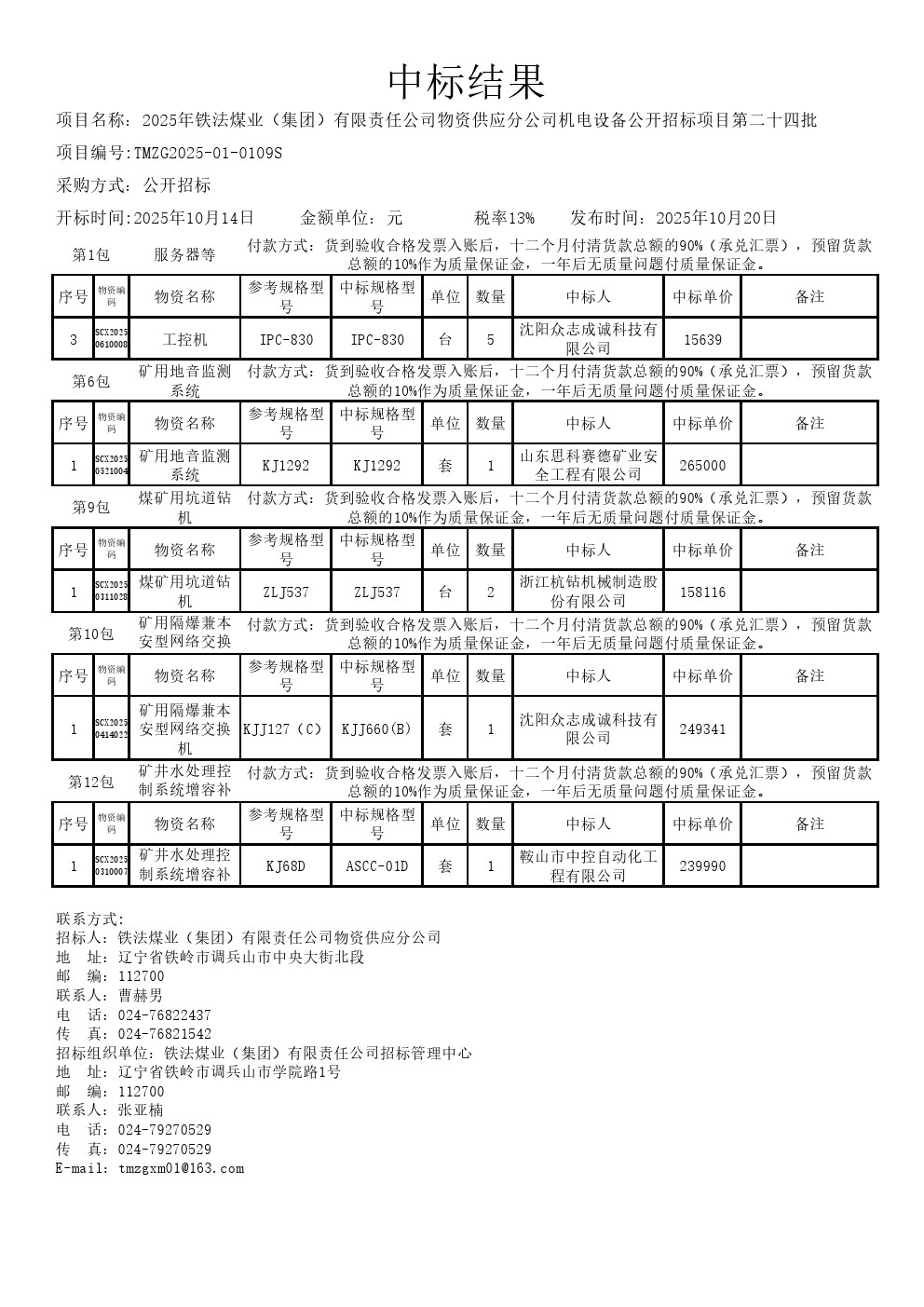 2025年10月14日机电设备公开招标中标结果公示(0109S)-1