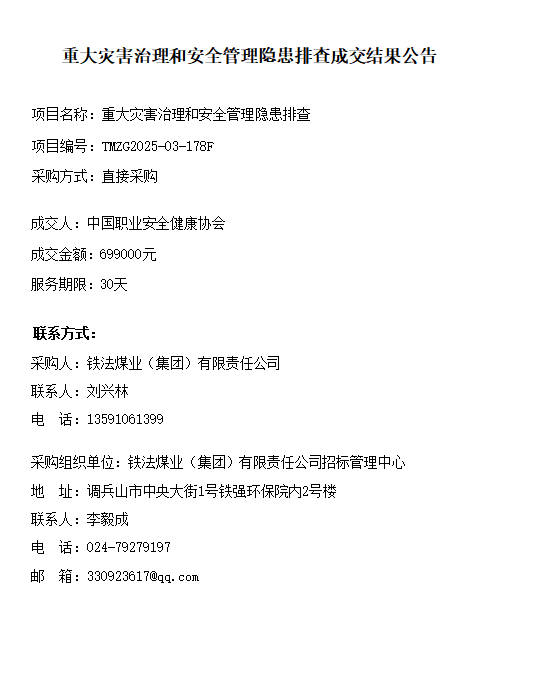 重大灾害治理和安全管理隐患排查成交结果公告