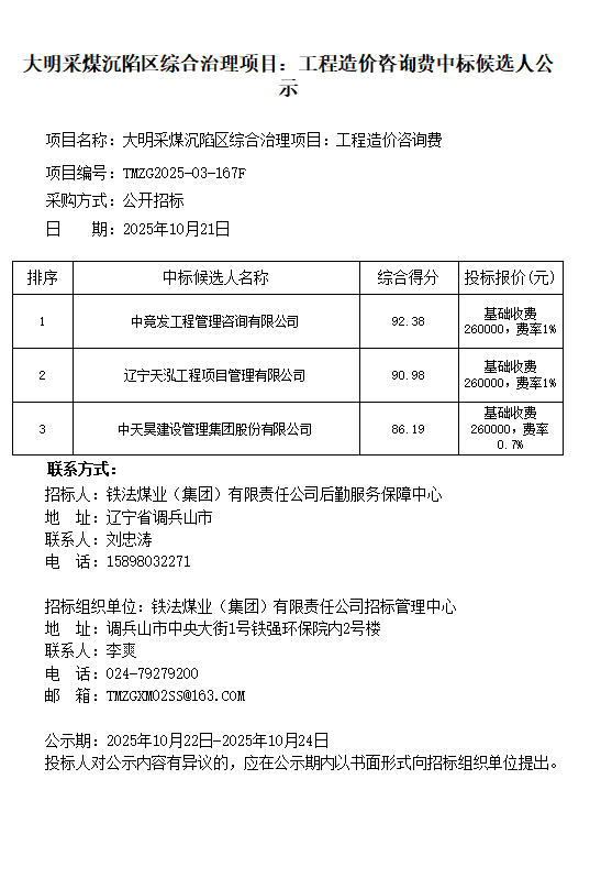 铁法煤业(集团)有限责任公司后勤服务保障中心大明采煤沉陷区综合治理项目:工程造价咨询费项目候选人公示