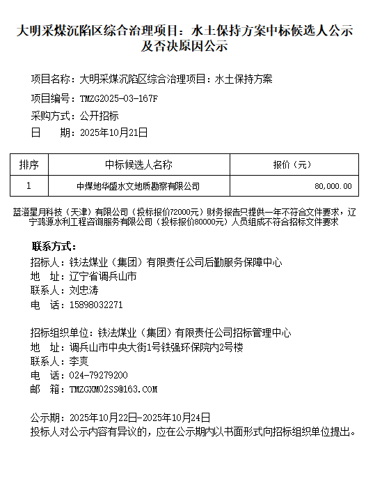 铁法煤业(集团)有限责任公司后勤服务保障中心大明采煤沉陷区综合治理项目水土保持方案候选人公示及否决原因公示