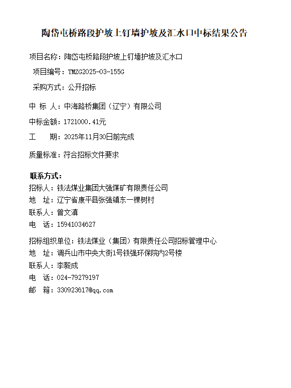 铁法煤业集团大强煤矿有限责任公司陶岱屯桥路段护坡上钉墙护坡及汇水口中标结果公告