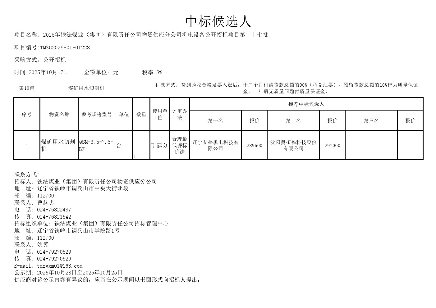 2025年10月17日设备第二十七批公开招标中标候选人变更公示(0122S)