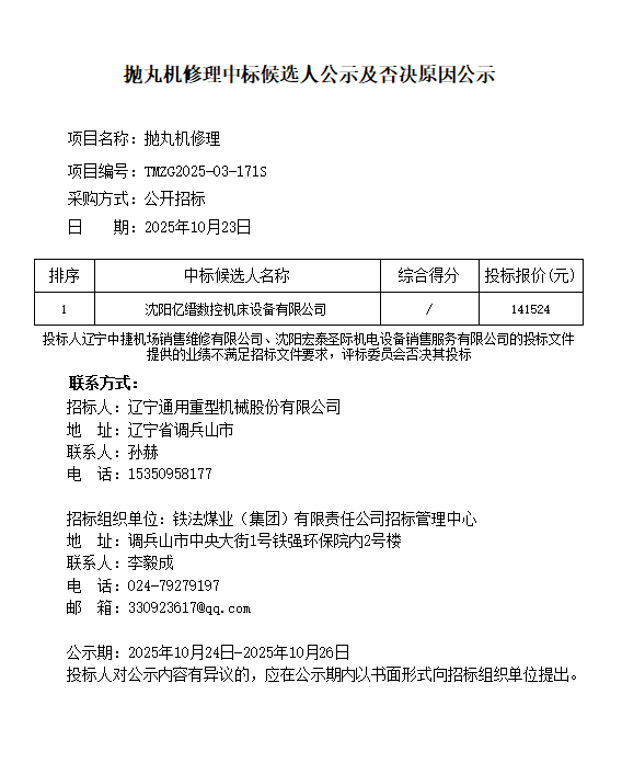 辽宁通用重型机械股份有限公司抛丸机修理候选人公示及否决原因公示