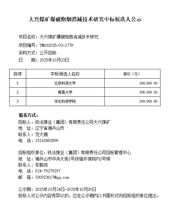 铁法煤业(集团)有限责任公司大兴煤矿爆破炮烟消减技术研究候选人公示