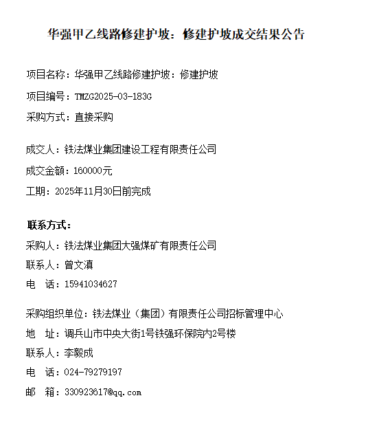 铁法煤业集团大强煤矿有限责任公司华强甲乙线路修建护坡:修建护坡成交结果公告