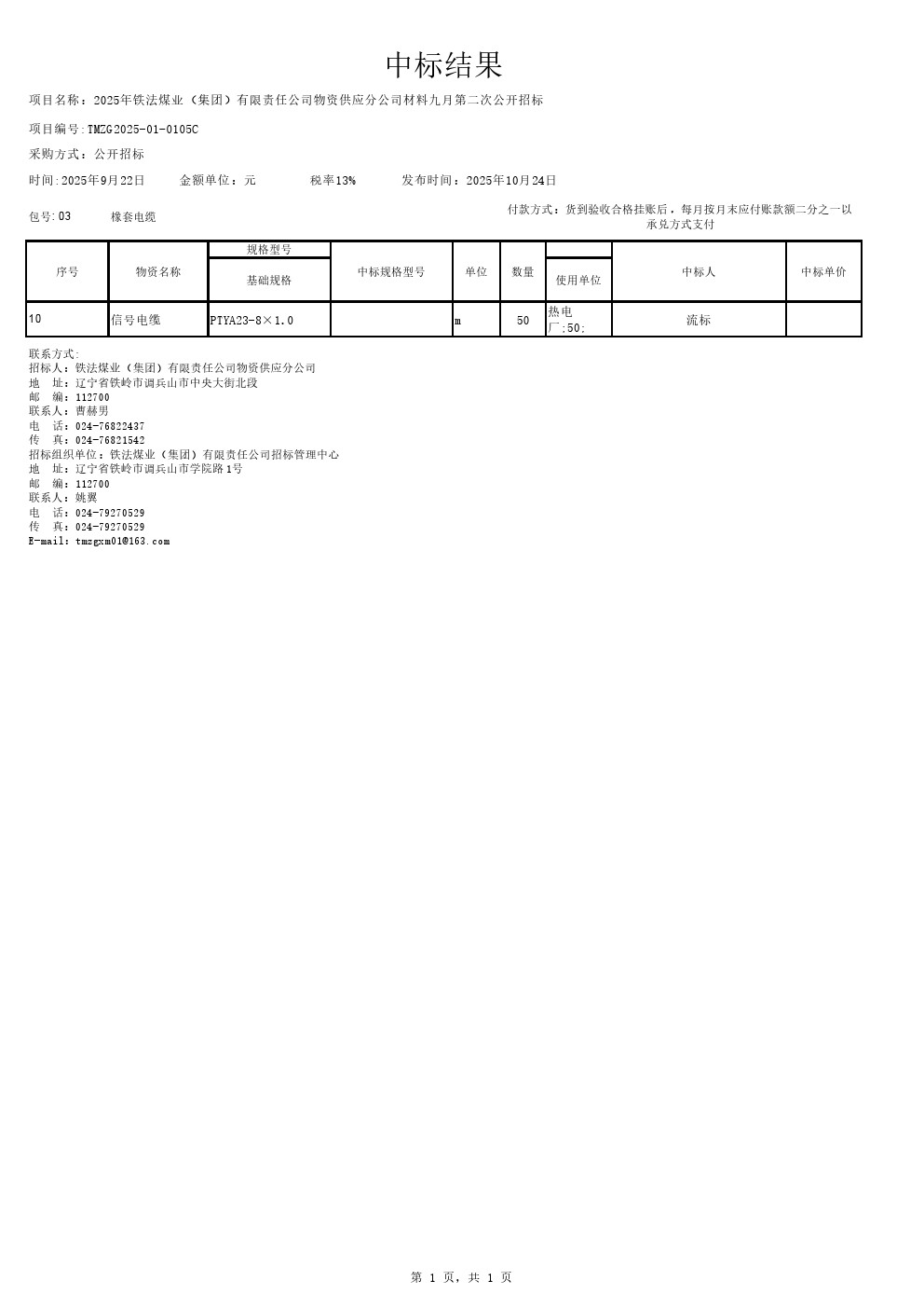2025年9月22日材料公开招标第3包第10项中标结果变更公告(0105C)2