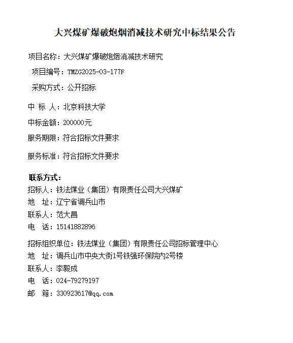 法煤业(集团)有限责任公司大兴煤矿爆破炮烟消减技术研究中标结果公告