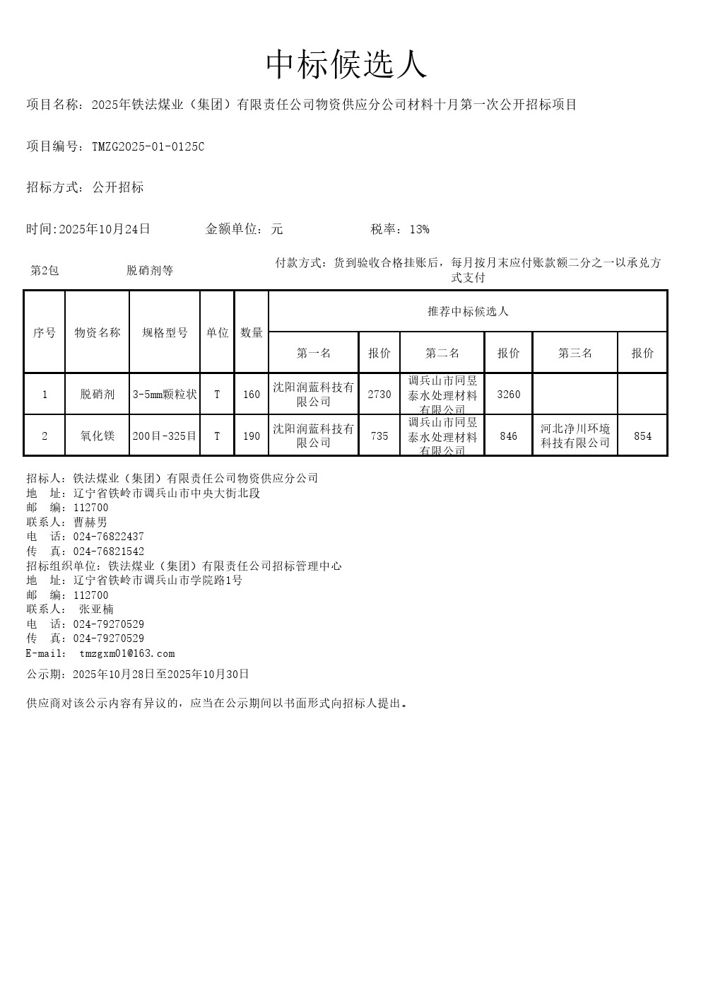 2025年10月24日材料公开招标中标候选人公示(0125C)