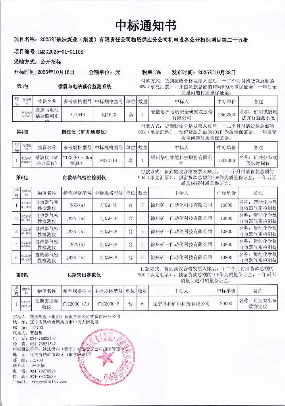 2025年10月16日机电设备公开招标中标通知书(0110S)