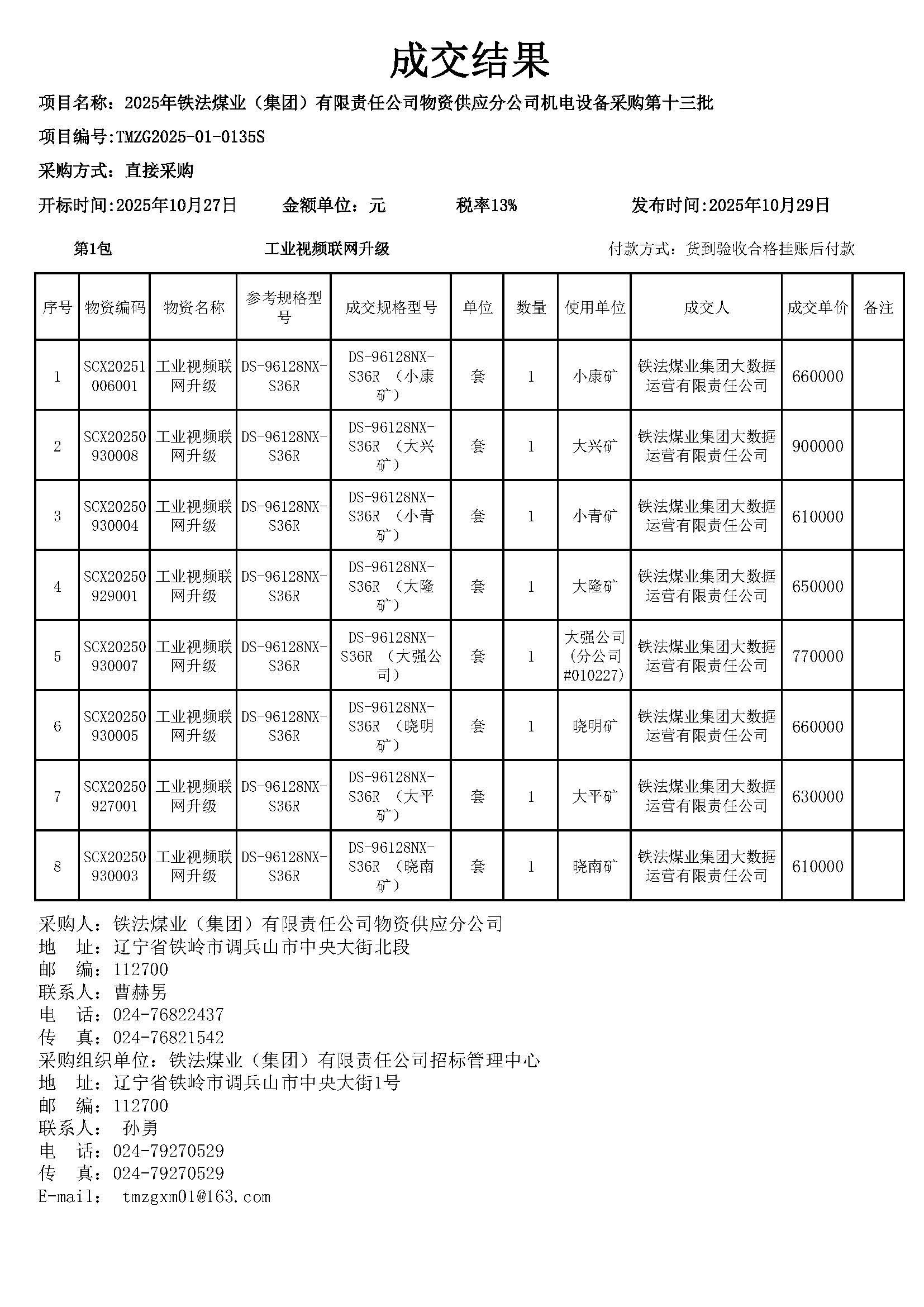 2025年10月27日机电设备成交结果公告(0135S)