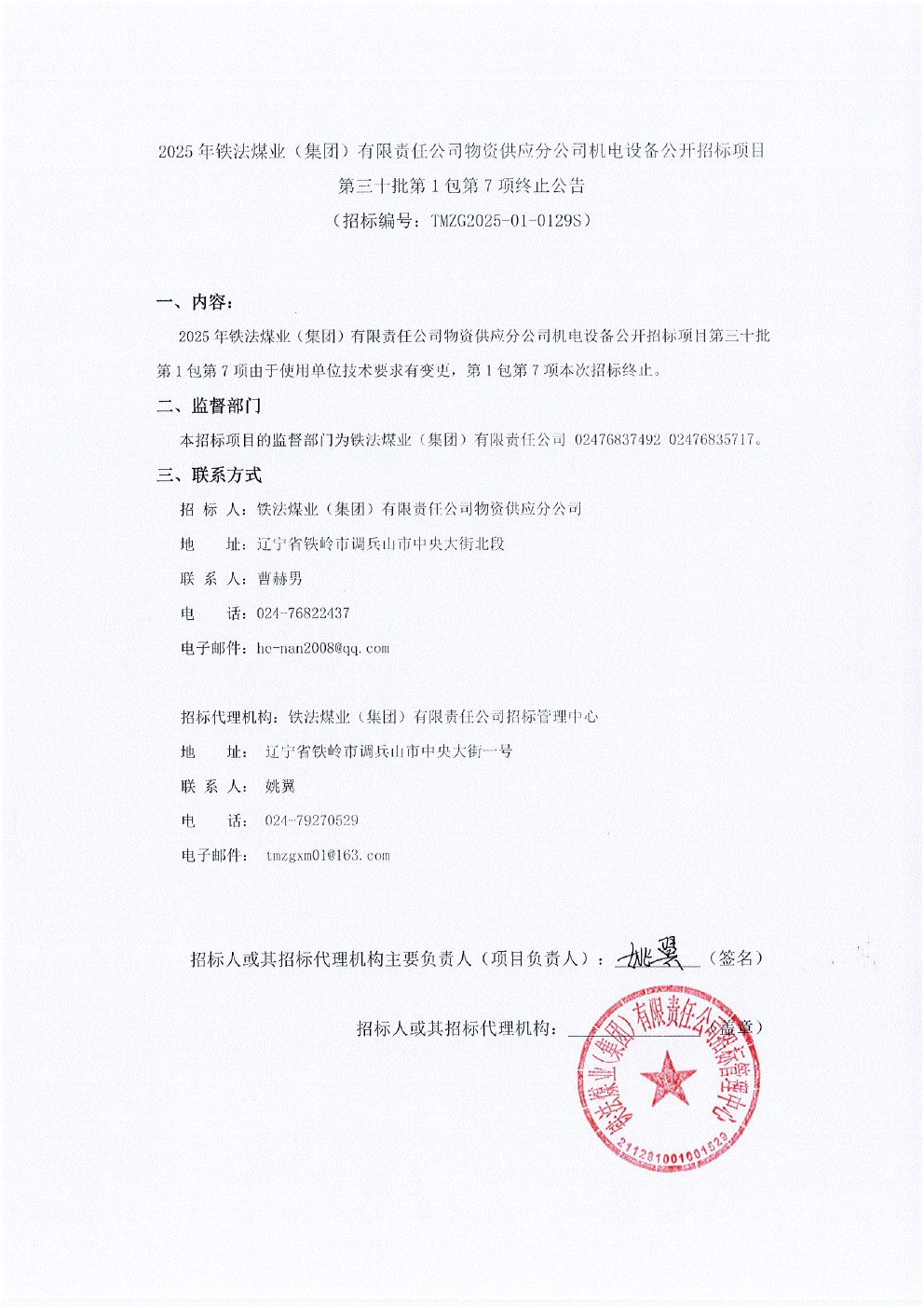 2025年10月31日设备第三十批公开招标第1包第7项终止公告(0129S)