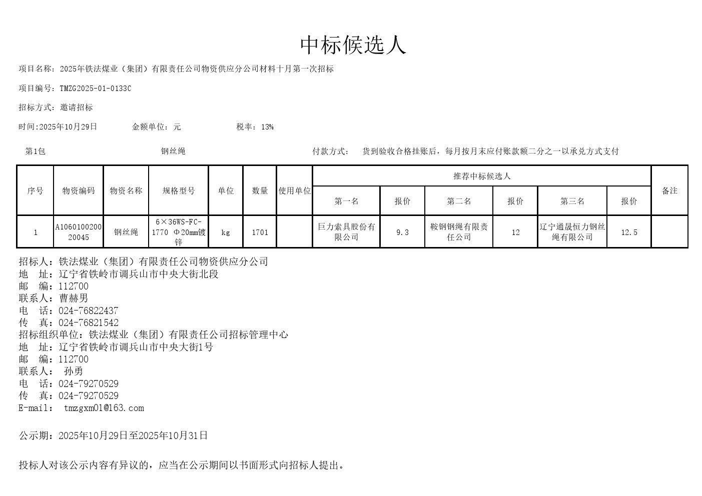 2025年10月29日材料邀请招标中标候选人公示(0133C)