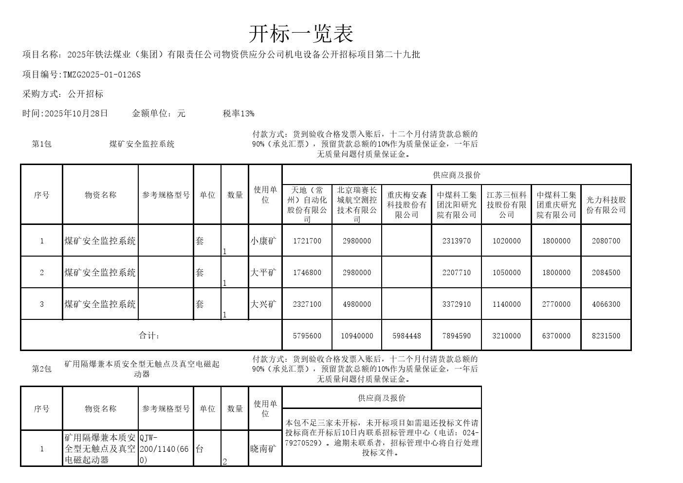 2025年10月28日机电设备公开招标第二十九批报价一览表(0126S)