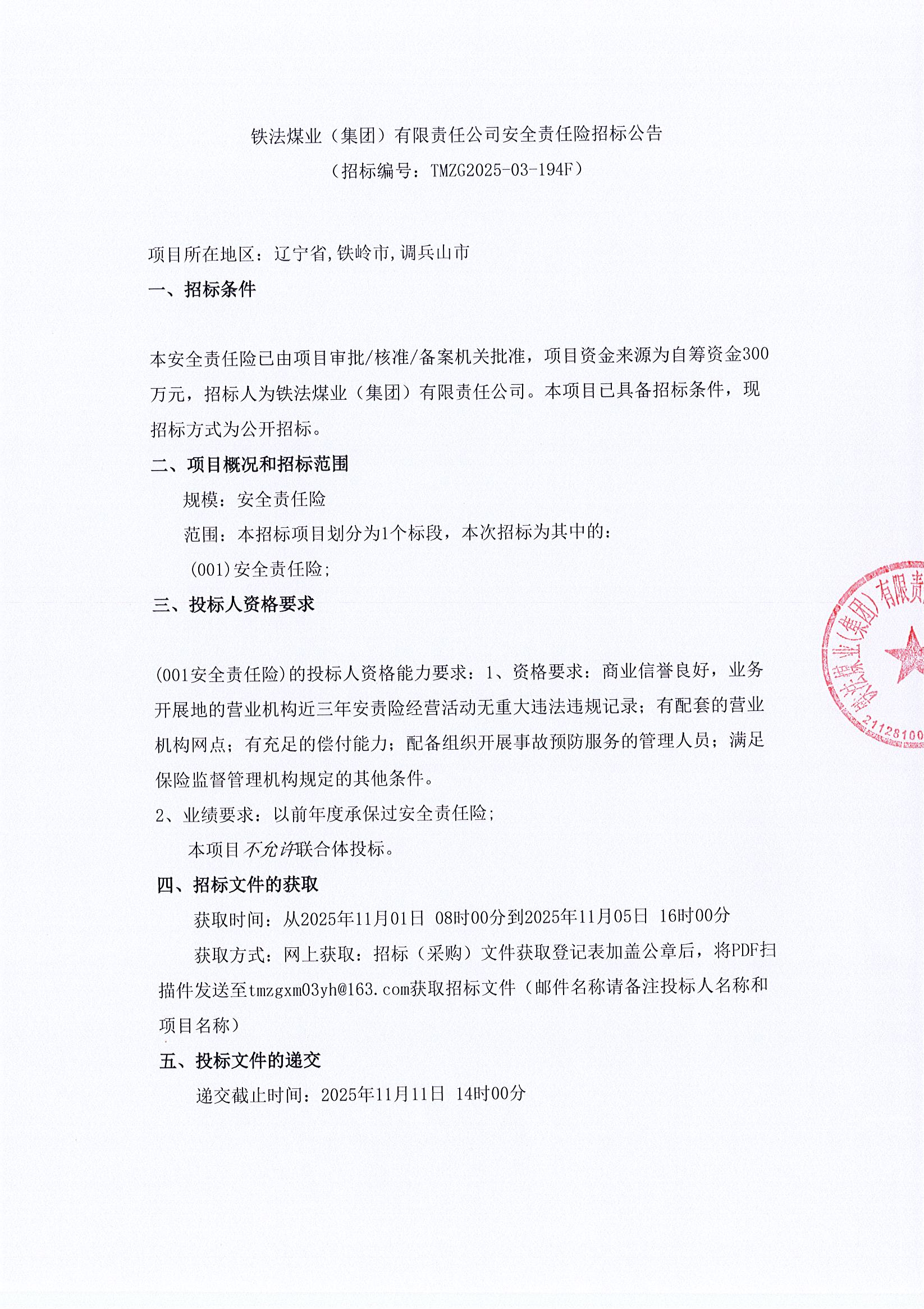 铁法煤业(集团)有限责任公司安全责任险招标公告