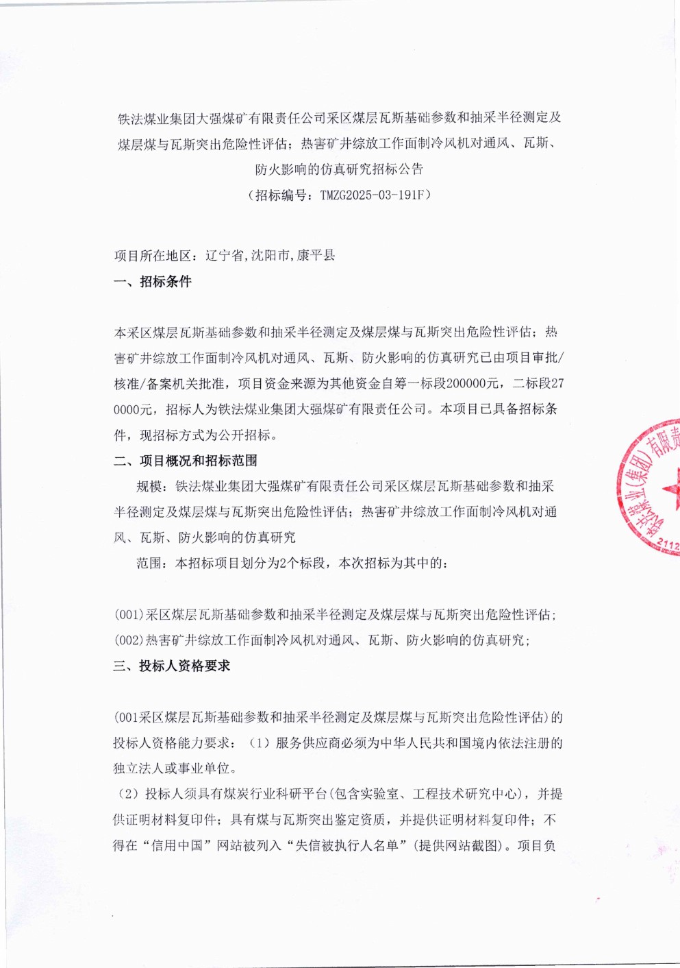 铁法煤业集团大强煤矿有限责任公司 采区煤层瓦斯基础参数和抽采半径测定及煤层煤与瓦斯突出危险性评估 热害矿井综放工作面制冷风机对通风、瓦斯、防火影响的仿真研究招标公告