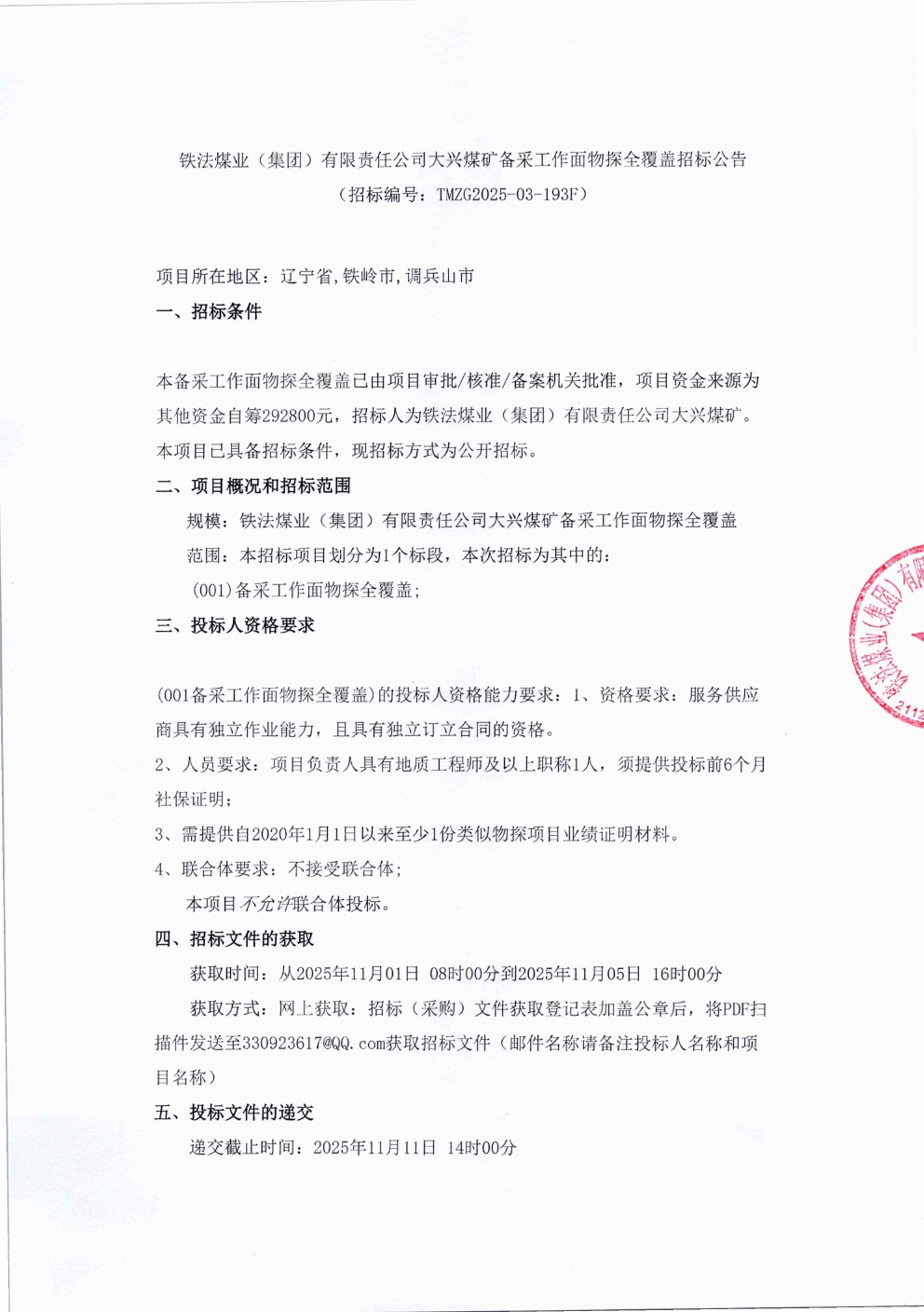 铁法煤业(集团)有限责任公司大兴煤矿 备采工作面物探全覆盖招标公告