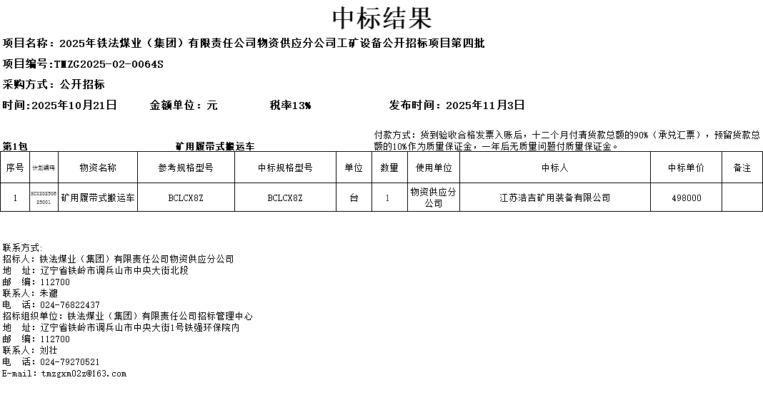 2025年10月21日工矿设备中标候结果公告(0064S)